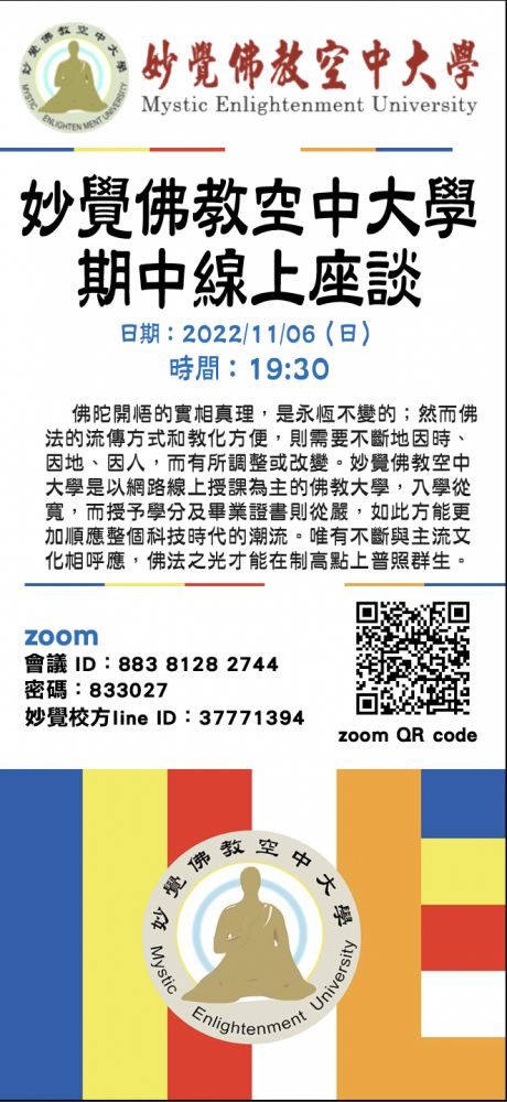 首頁 / / 2022學年度上學期期中線上座談會 歡迎認識妙覺 2022/11/6 ( 日) 19:30