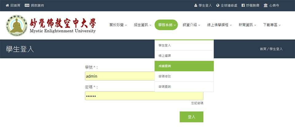 因妙覺空大官網(mebou.org)學務系統已建置完成,除新學年(2017學年)可線上選課,並可查詢歷年修業成績。校務處已將學員各科成績輸入系統,包括2016學年下學期未寄發之成績,請自行登入查詢,校務處將不再主動寄發成績單。