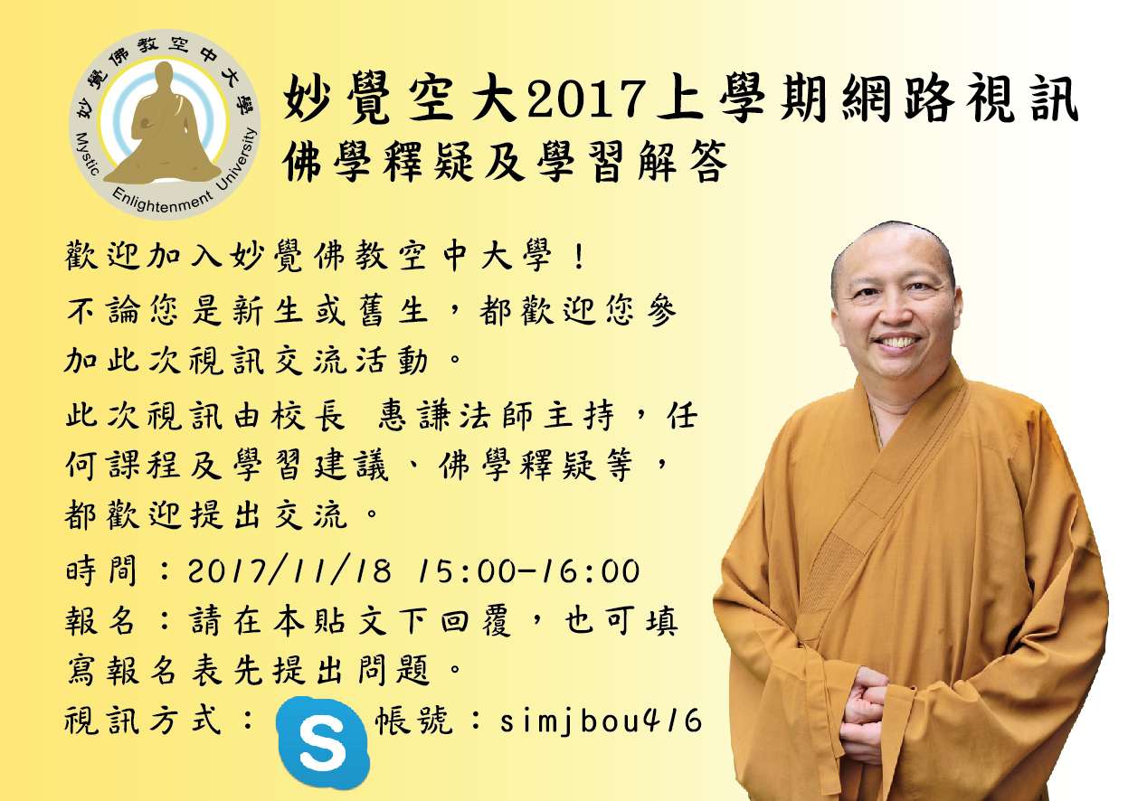 歡迎加入妙覺佛教空中大學! 不論您是新生或舊生,都歡迎您參加此次視訊交流活動。 此次視訊由校長 惠謙法師主持,任何課程及學習建議、佛學釋疑等,都歡迎提出交流。 時間:2017/11/18 15:00-16:00 報名:可在本貼文下回覆,也可填寫報名表先提出問題。