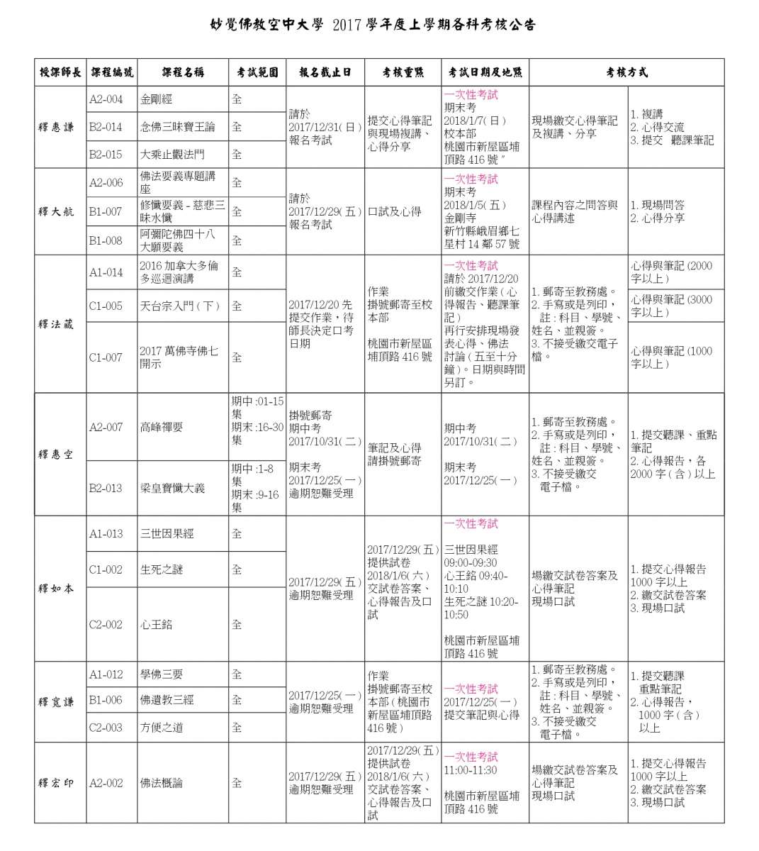 妙覺佛教空中大學2017學年度上學期各科考核完整公告。