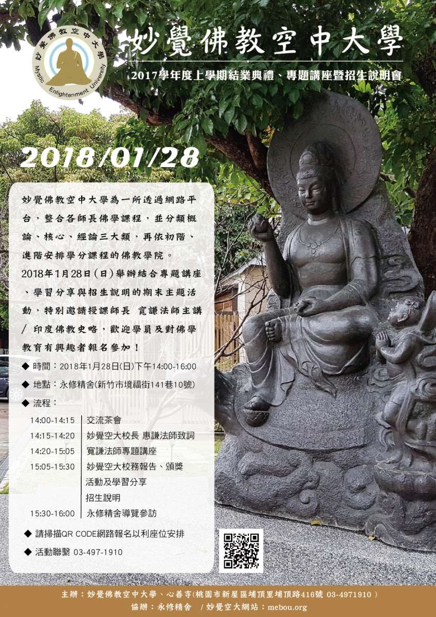 妙覺空大於學期末(2018年1月28日(日))擴大舉辦結業活動。除了邀請妙覺師長 寬謙法師舉辦專題講座/印度佛教史略,亦針對校務、入學招生等做詳細說明,會中亦頒發表揚學習優異學員。敬邀妙覺空大學員、護法志工及對佛學有興趣者報名參加!