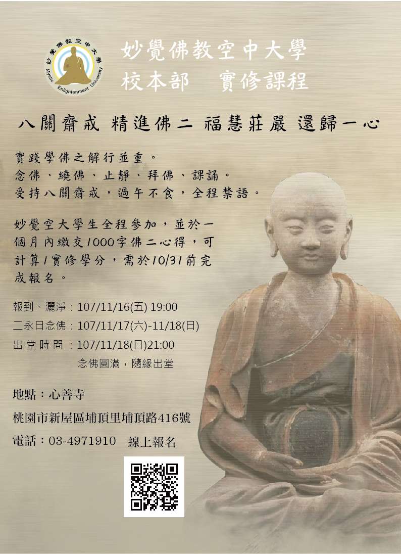 僅訂於2018年11月16日(五)灑淨,11月17日(六)-18日(日)舉辦精進佛二暨八關齋戒。