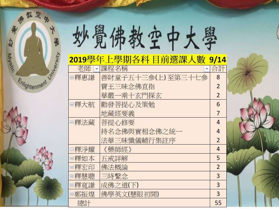 諸位菩薩大德 妙覺佛教空中大學 2019學年度上學期網路選課加退選 即將在9/15截止 還沒選課的同學敬請把握因緣 過了9/15 您隨時隨地想選讀 歡迎直接連絡教務處 03-4971910 歡迎加入 妙覺校方 line ID:37771394 妙覺公告專區 line @ ID:@eez9313b 感恩您 功德無量 妙覺空大 教務處 合十